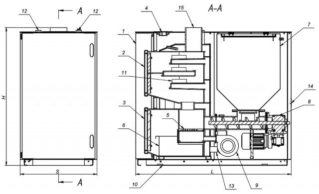 Palivo se přivádí automaticky pomocí šnekového podavače. Kotel má přípojky o velikosti 1" pro výstup topné vody a vstup zpětné vody s vnitřním závitem. Výměníky tepla jsou umístěny vodorovně v komorách výměníku tepla. Jsou navrženy tak, aby zpomalovaly proud spalinových plynů, mají vliv na zvýšení účinnosti kotle a jeho výkonu.