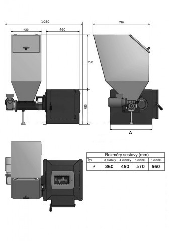 Podstavec přestavbové sady je univerzální sestava může být nainstalována na levé nebo na pravé straně kotle Viadrus. Palivová nádrž ocelová a opatřena odolnou práškovou barvou, je schopna pojmout přibližně 180 kg paliva (uhlí).