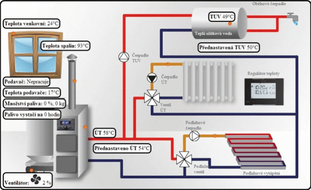 všech zařízení kotlové instalace a provoz každého z nich se zobrazuje jako animace. Má možnost prohlížet historii teplot v podobě grafů a historii alarmů regulátoru.