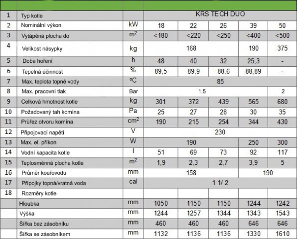 Kotle typu KRS TECH DUO s retortovým hořákem jsou určeny pro vodní instalace ústředního vytápění otevřeného systému s gravitační nebo nucenou cirkulací vody. Kotle jsou svařovaná ocelová konstrukce, z plechů zaručujících dlouhodobé používání, odolná vůči faktorům, které je ovlivňují během provozu. U kotle je realizována vysoce účinná technika spalování jednotné dávky paliva za přesně definovaných podmínek. Jsou vybaveny speciálně vyrobeným hořákem z litiny, kterým pomocí šnekového dopravníku dodáváno palivo z násypky. Výhodou těchto kotlů je: 5. třída a ekodesign, vysoká účinnost, automatická práce, rychlá a snadná obsluha, úsporné, bezdymové a ekologické spalování paliva.