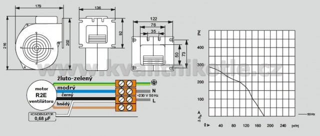 Vstupním vzduchový otvor je chráněn mřížkou a výfuk je zajištěn přírubou s montážními otvory.