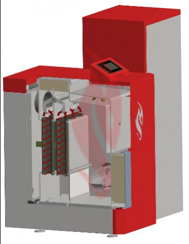 Kotel je svařenec, kde vnitřní část tělesa kotle je svařena z 6-ti mm oceli. Výměník tělesa kotle se skládá z dvouřadého trubkového výměníku. V každé trubce je umístěn turbulátor, který zajišťuje jednoduché čištění výměníku kotle pomocí páky na boku kotle v základní výbavě.